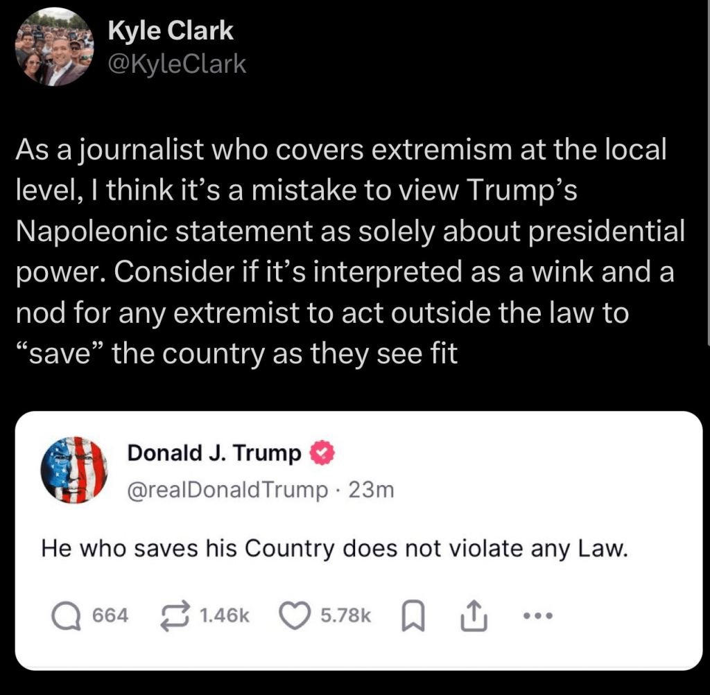 2. As journalist Kyle Clark notes, it is a call to arms to anybody who supports Trump’s hostile takeover – if you are fighting to support him, do whatever you need to do. If you’re fighting on his behalf, laws don’t apply.